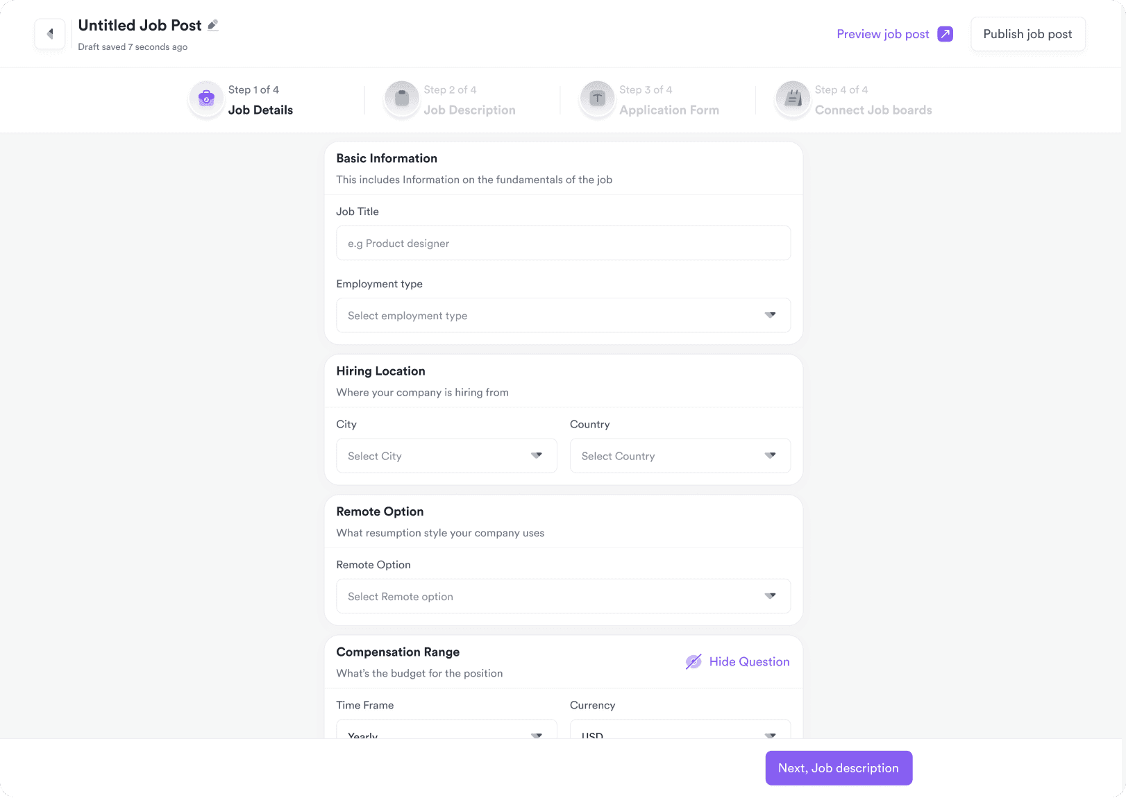 This includes title, employment type, hiring location, the nature of the job (remote or not), and salary range. Feel free to add anything else you find relevant.